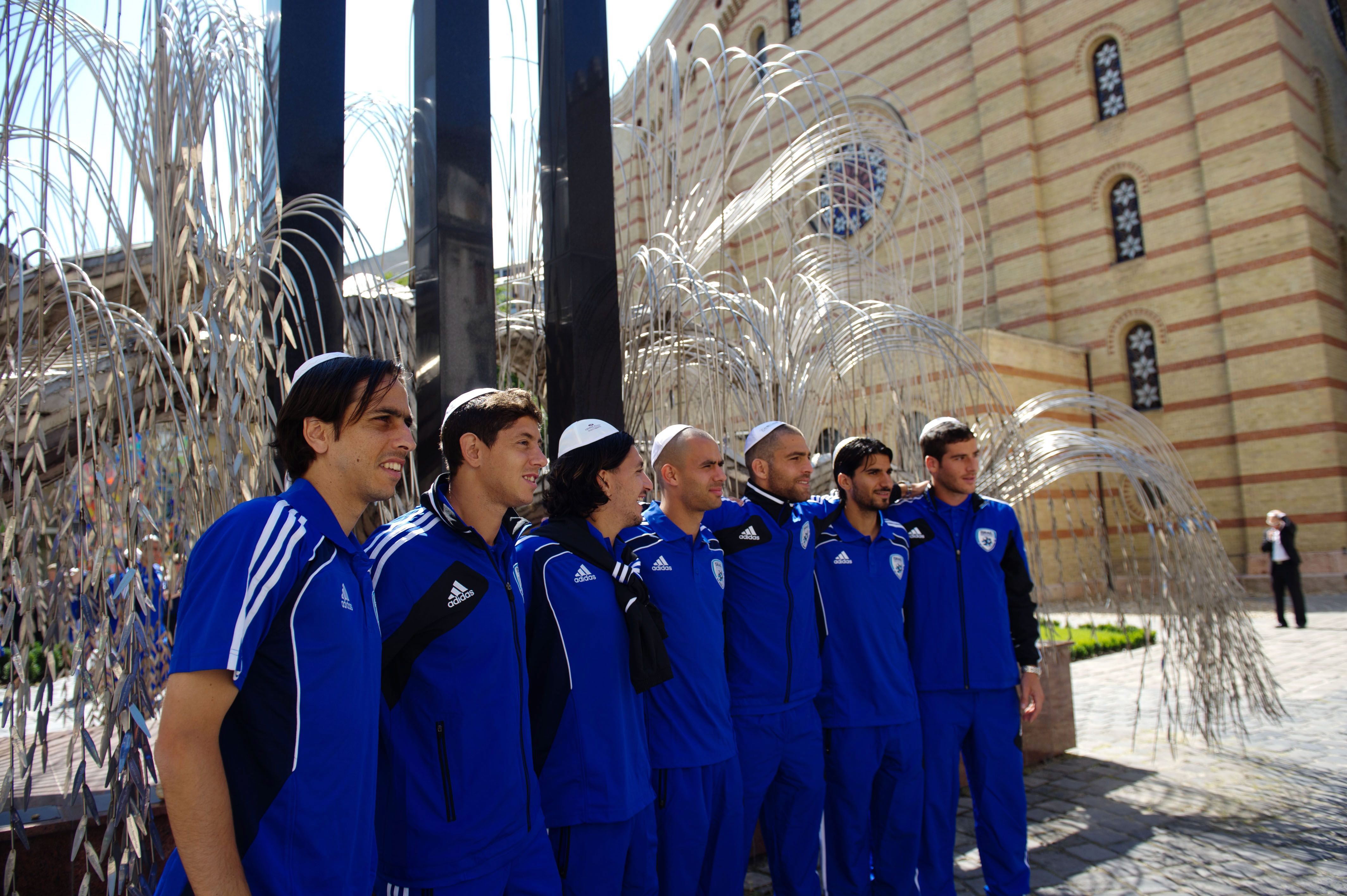 epa03361814 Members of the national soccer team of Israel pose for a group photo during their visit the Raul Wallenberg Memorial Park in the garden of the Dohany Street Synagogue in Budapest, Hungary, 14 August 2012, one day ahead of the Hungary vs Israel friendly soccer match. EPA/LASZLO BELICZAY HUNGARY OUT